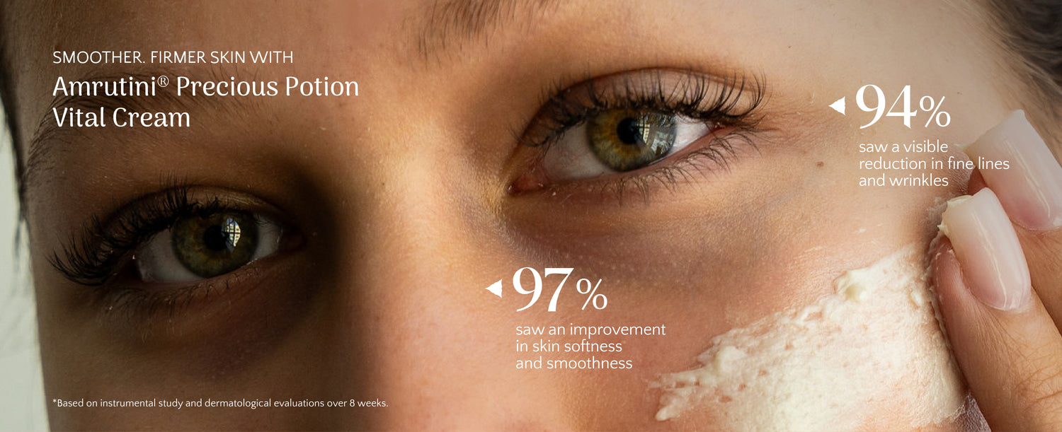 As we age, our skin becomes more fragile, and loses its inherent strength and elasticity. The facial lines we tend to target are simply the symptom. Therefore, with Amrutini® Precious Potion, we focus on intense nourishment, and rebuilding skin’s inherent strength and firmness. This silky moisturizer will leave your skin feeling deeply rejuvenated while reducing the appearance of fine lines.